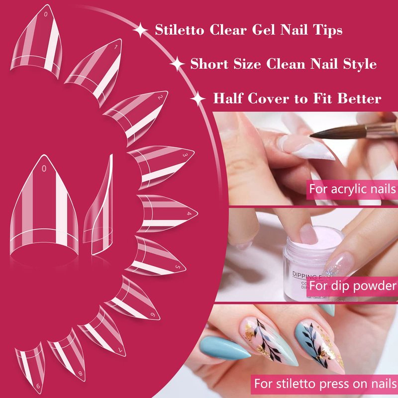 The 500 PCS short half cover stiletto false nails are made from environmental friendly high quality ABS material. Easy to shape and file, leave no trace while folding. The short clear false nail make it fit your natural nail better, and the effect is more durable, which offer you a nice and durable manicure experience. You can decorate your nails with nail polish,dip Powder, acrylic powder, makes your nails more beautiful. Clear nail tips are great for professional nail artist and nail art beginner, suitable for nail salons and DIY nail art at home,perfect for daily and event nail decoration. Also it's a great gift for your wife, girlfriend, mother or sisters on Christmas/Thanks Giving/New Year/Parties/Wedding/Costume ball/Halloween/etc.