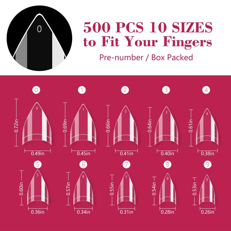 - 【Short Stiletto Nail Tips Style】500 PCS Short Stiletto fake nail tips design are easy to shape and file, leave no trace while folding. Short length is for an able and clean nail style, keep the color good without separation or exposure, which is more suitable and convenient for daily life. 10 sizes nail tips for you to choose.