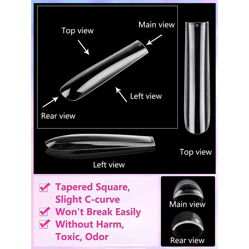 - STURDY & LONG LASTING FOR A MONTH: These clear square nail tips are made from high quality ABS without harm, toxic, odor, more durable and flexibler than traditional plastic tips. Strong toughness, no crease and whitening when cutting and bending. The upgraded extra-rectangular nail tips can withstand more pressure and won't break easily after applying nail glue. According to the right using process, it can last for about a month!