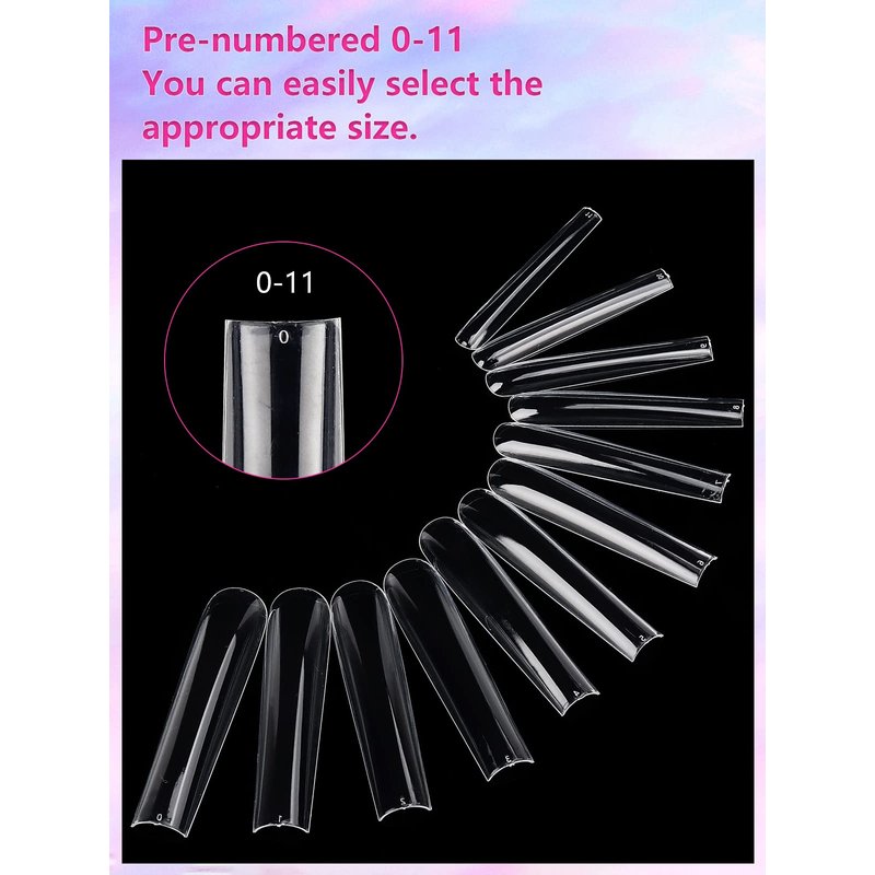 - 12 SIZES FIT YOUR NAILS: 12 sizes with size number on the top of the tips can easy pick proper tips for your nail and fit most people's nails. And 2 extra size can suit bigger or smaller nails, in case 10size can not fit few of your nails. With them, you can shape them and create your own unique manicure look for yourself and your customers. Come and keep up with the fashion trend of long nails!