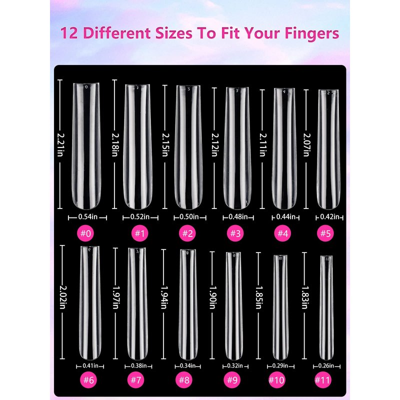 - XXL ACRYLIC NAIL TIPS: Extra long square nails full cover are perfect tapered squares, slight c-curve, nice shape. Gel nail tips with suitable arc for your nail surface can wear comfortably. The longest size is 2.21inch in length for size 0 and shortest lenght 1.83inch for size 11. It's much longer than other nail tips on the market. Super eye-catching and pop! Girls who like long nails and manicures, don't miss it!