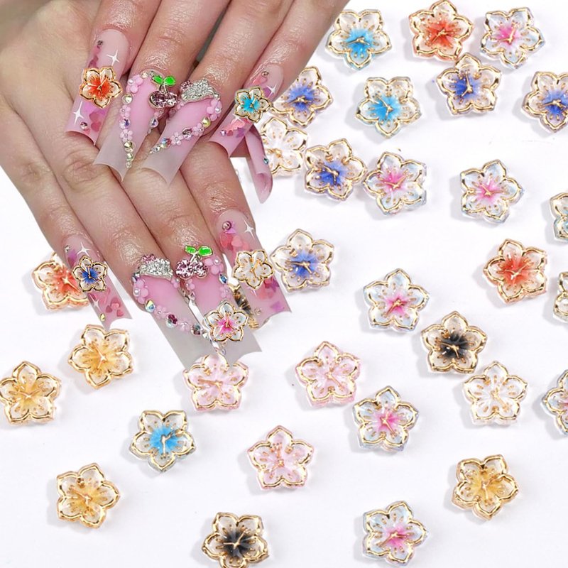 50Pcs Flower Nail Charms 3D Lovely Flower Charms Nail Rhinestones Gold Edge Glaze Design Resin Nail Jewels Colorful Floral Nail Art Charms Supplies Cherry Blossom Petals Nail Gems for Acrylic Nails