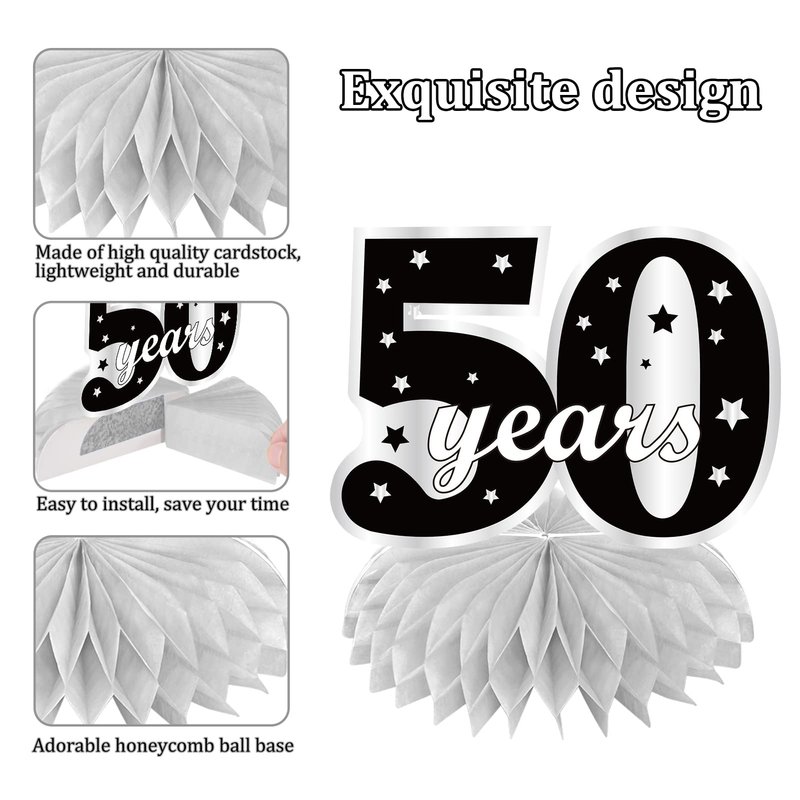 - [You will get] - 8 Pcs Black White and Silver 50th Birthday Honeycomb Centerpieces Decorations, including 8 pieces of 50th Birthday theme pattern cardboard, 8 paper honeycomb (5 silver and 3 black), enough to decorate your birthday party.