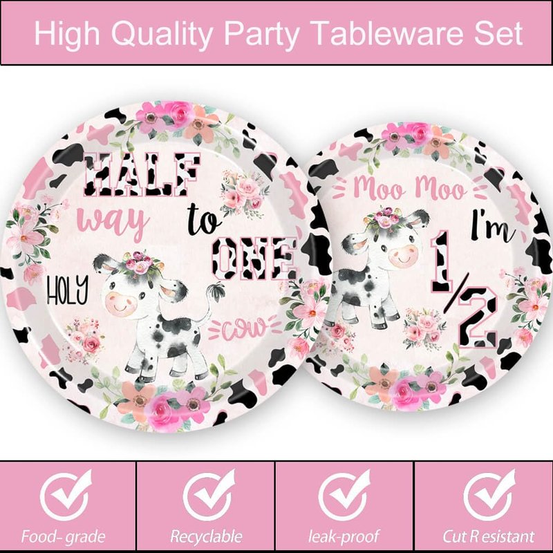 Holy cow girls half birthday party tableware is great to decorate farm animals half birthday party, holy cow baby shower party, Girls six months birthday party, Moo Moo half way to first party, etc.