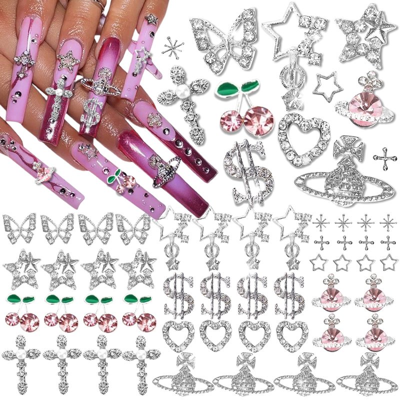 52 PCS Nail Charms and Gems Y2K Butterfly Star Nail Charms Silver Heart Cross Money Charms for Acrylic Nails Design Cherry Nail Gems Jewels for Nail Art Supplies