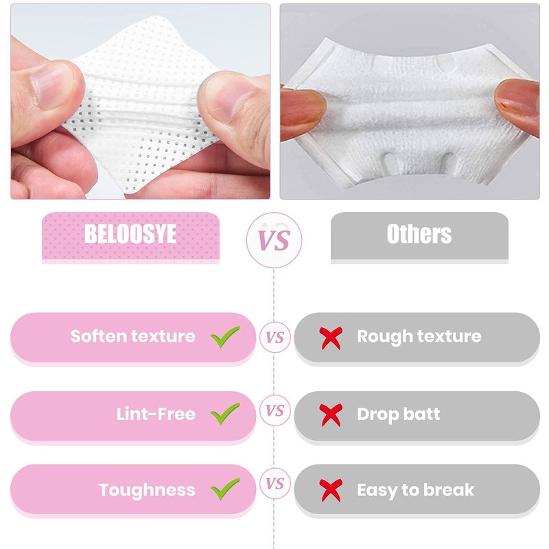 - 【LINT FREE NAIL WIPES】: BELOOSYE eyelash extension glue wipes is made of high quality non-woven fabric(Not Cotton), no scrap or crumbs shedding, lint-free, meet your high requirement for tidy and clean. Soft surface, strong water absorption and anti-static,ideal for professional salon and makeup use. Use our professional Glue Wiping Cloth instead of paper towels, to enhance the professional image of your salon, enhance customer’s trust and gain more praise.