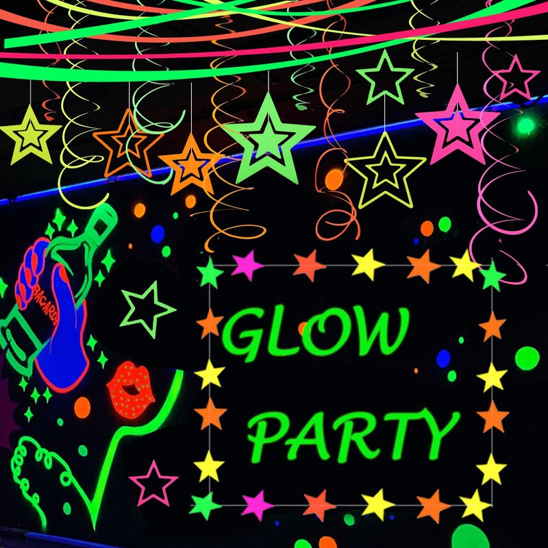 - 【GREAT VALUE 】 Package Include: 37 Ft/2pcs Star neon garland; 37 Ft/2pcs Round dot fluorescent garland; 20 Ft/2pcs Rectangle neon Strip; 407 Ft /4 Rolls long neon glow streamers; 34ft/10 Pcs neon glow Swirl Streamers;8pcs Glow Star ornaments.