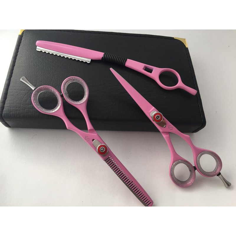 5.5" Professional Barber Razor Edge Powder Coated Hair Cutting and Texturizing Shears Scissors Pink with Straight Raxor Student Teacher Kit Set+case Black