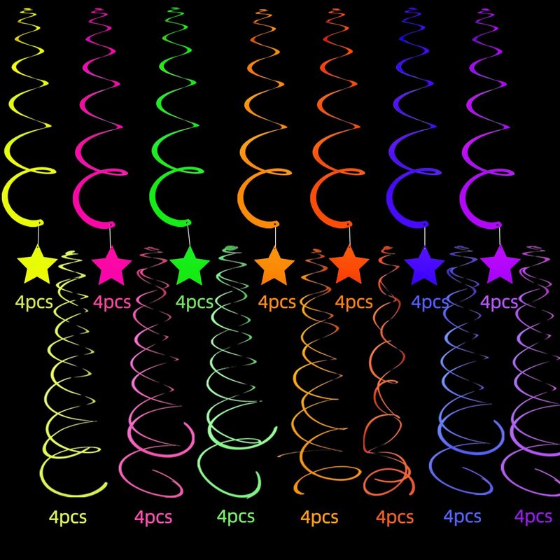56 Pieces Rainbow Hanging Swirl Decorations Neon Swirl Streamers UV Neon Garland Ceiling Decorations Glow in The Dark Neon Party Supplies and Decorations Black Light Party Kit for Birthday Wedding