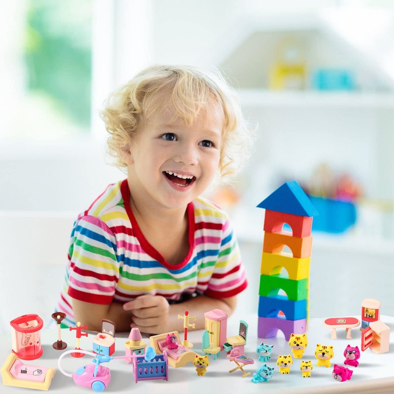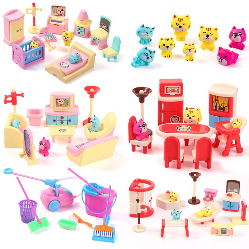 - Fun Dollhouse Accessories Kit: you will receive 4 sets of small doll house furniture plastic, including bathroom, bedroom, living room and dining room, 8 cute cat figures and a dollhouse cleaning kit set, which are nice combinations for your guys to make play games and have a lot of fun