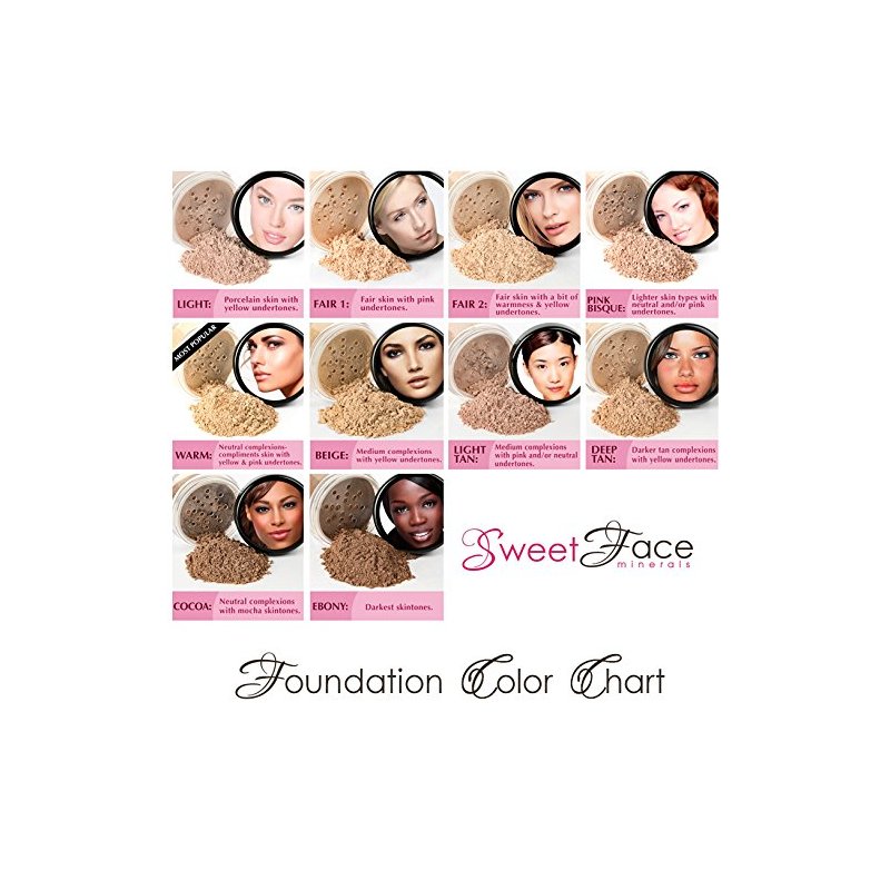 Mineral Foundation: Sweet Face Minerals foundations are all natural and very lightweight. Our products never appear heavy or look caked and are wonderful for every skin type. Will not cause irritated itching skin or acne. Mineral Concealer: Our concealers will offer more coverage than your regular foundation blend. Concealers are ideal for hiding dark under eye circles, and concealing blemishes, camouflaging imperfections and will help to neutralize the look of splotchy skin. Sweet Cheeks Blush: A soft and natural earth toned pink color. This shade is very mild and because it's mineral makeup, it has staying power! This color can also double as an eye shadow. Green Corrector: Green correctors are far more effective in covering redness on the skin. Perfection Finishing Powder: This silky feather-soft powder provides weightless, breathable layering to your skin. Brush it on after your makeup has been applied. It's light and delicate and gives the appearance of perfection! Includes an instruction card for applying your makeup like a pro. Pure Ingredients: Titanium Dioxide, Zinc Oxide, Iron Oxide, Sericite, Rose Powder, Kosher Grade Rice Powder, Mica, Kaolin Clay. The following kits are 20 gram sifter jars filled to capacity with 9 grams of powder.