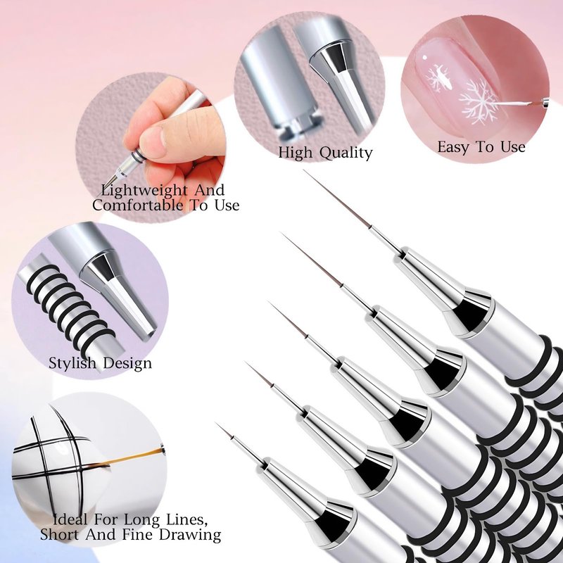 5pcs Nail Art Liner Brushes,Liner Brush For Nails,Nail Art Brush For Long Lines,Thin Details,Fine Drawing,Liner Brush UV Gel Polish Painting Nail Design Sizes 7/9/11/20/25mm(Silver)