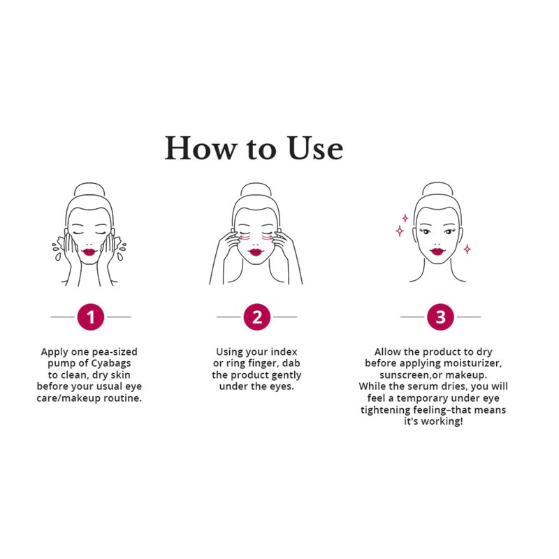 Squeeze one pump of CyaBags onto the palm of your hands. Gently dab the eye bag serum into the skin using your ring finger.