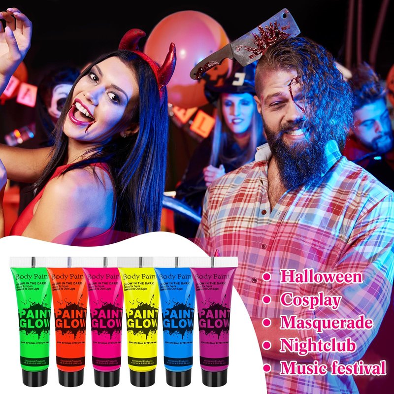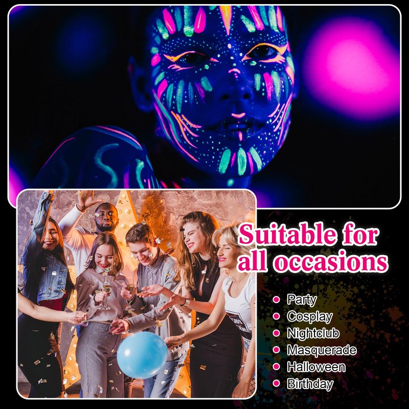 - ☆ Bright Colors Under UV Lighting Neon Body Paint: High pigment glow blacklight face body paint can use for eye ,face and body. Fit for fancy ball, parties, club,photoshoot, or night-out.Festival like Halloween,Christmas, New Year, Birthday, Valentine's Day,etc.