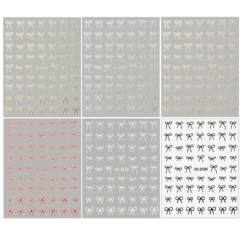 - 【6 Colors Bow Nail Stickers】You will get a bow sticker pack set with 6 different colors of bow stickers in red, white, black, gold, silver and rose gold, one of each color and 62 bows on each sticker.