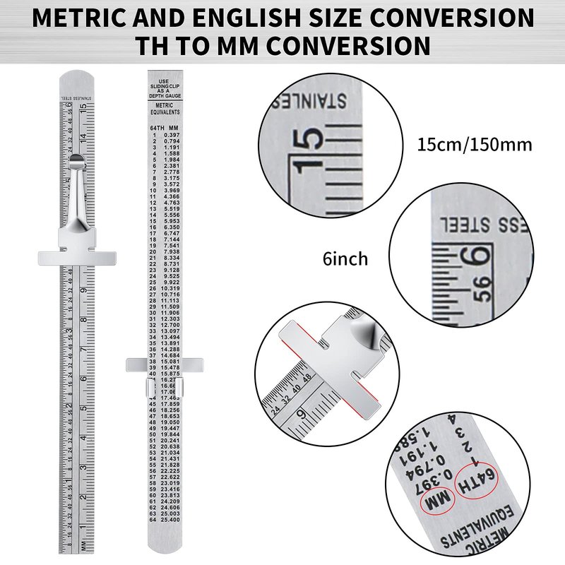 - Steel Ruler: the back of 6 inch ruler is engraved with a conversion table from inches to mm, which facilitates the conversion of various measurement data, offering you considerable convenience