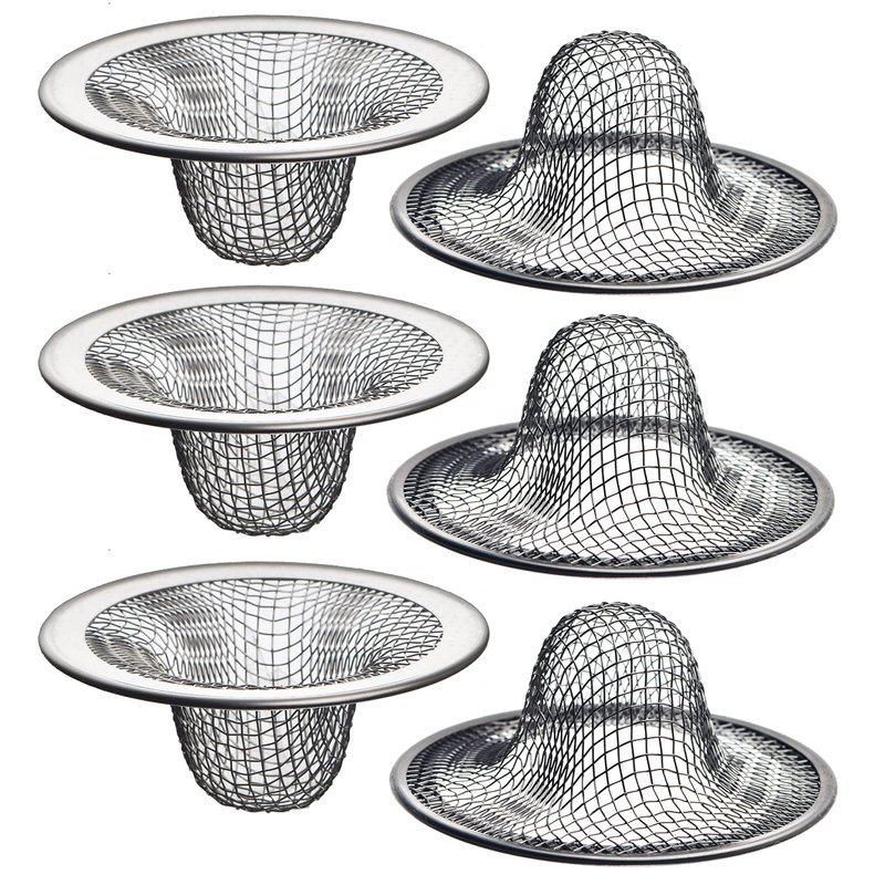 6 Pack Mesh Sink Drain Strainer for Bathroom, Utility, Slop, Laundry, RV and Lavatory Sink. Our strainers made of quality rust-resistant, durable and reliable material. Perfect for sinks for daily usage for long lasting protection against drainage clogging. 2.125” Top diameter and 1" Basket diameter. Comes with rim to fit over sink's drain. Basket Style design. Efficient anti-clogging strainer lets liquid flow into the drain while it blocks particles. Allows to be cleaned easily without hassles.