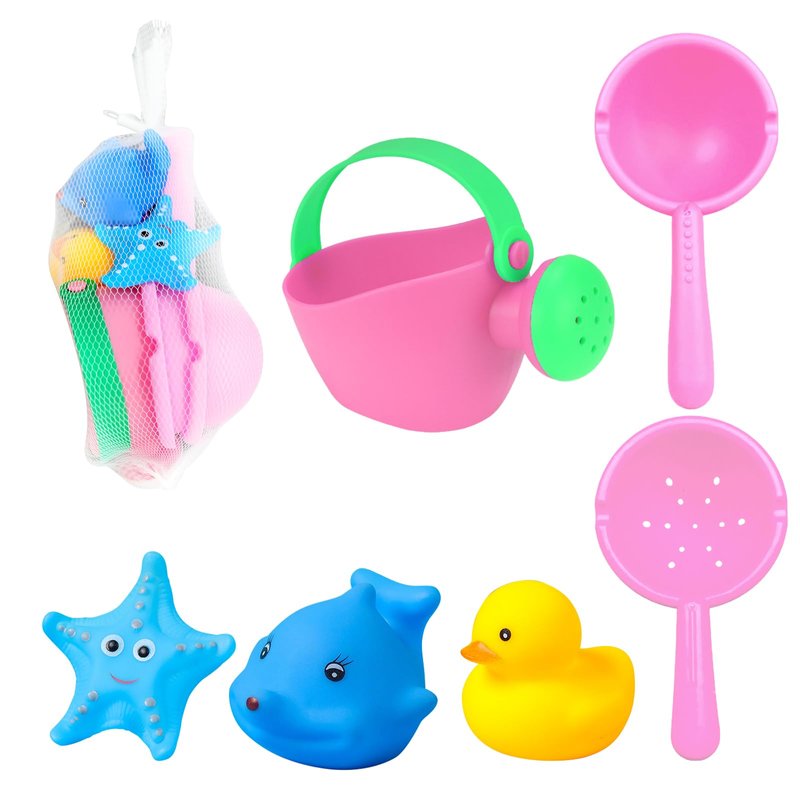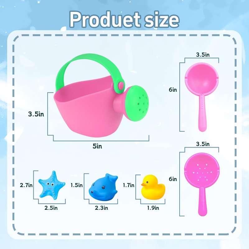 - [ Fun Baby Bath Toys Set ] You will get 6 water toys for toddlers. Includes mini watering pot, spoon, duck, dolphin, starfish. Cute bath toys set will make your little sweetheart fall in love with bath.