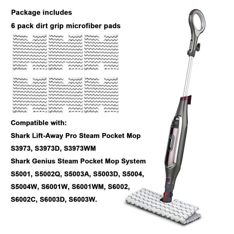 - Package includes 6 pack dirt grip microfiber pads for Shark Lift-Away Pro Steam Pocket Mop S3973, S3973D, S3973WM and Shark Genius Steam Pocket Mop System S5001, S5002Q, S5003A, S5003D, S5003CO, S5004, S5004W, S6001W, S6001WM, S6002, S6002C, S6002NP, S6003D, S6003W, QM5006QBL, QM5006QGN, QM5006QRD, QM5006QWH. Compatible with Shark model P184WQ&XTP184 touch-free dirt grip washable pads. Fit for both the Genius mop head and the Intelli-Mop head.
