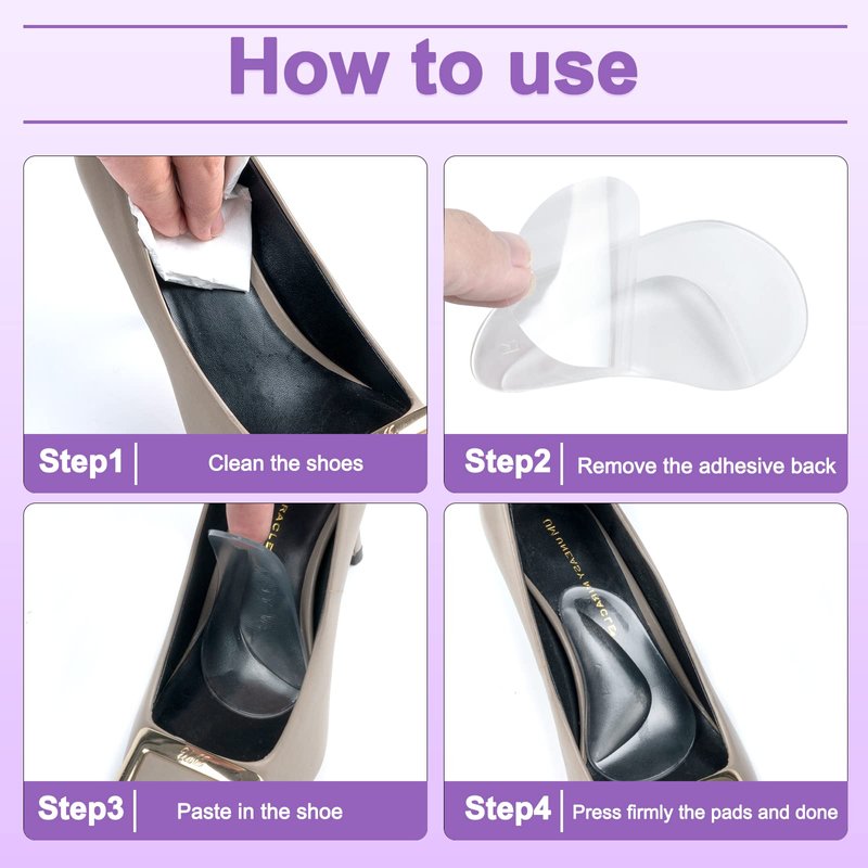 - SELF-ADHESIVE & NON SLIP: Before use the arch pads, cleaning the shoes first, then simply remove the adhesive cover from the insoles, and place them along the inside edge of your shoes under your arch and firmly press. The strong sticky cushion pads are equipped with strong adhesive properties.