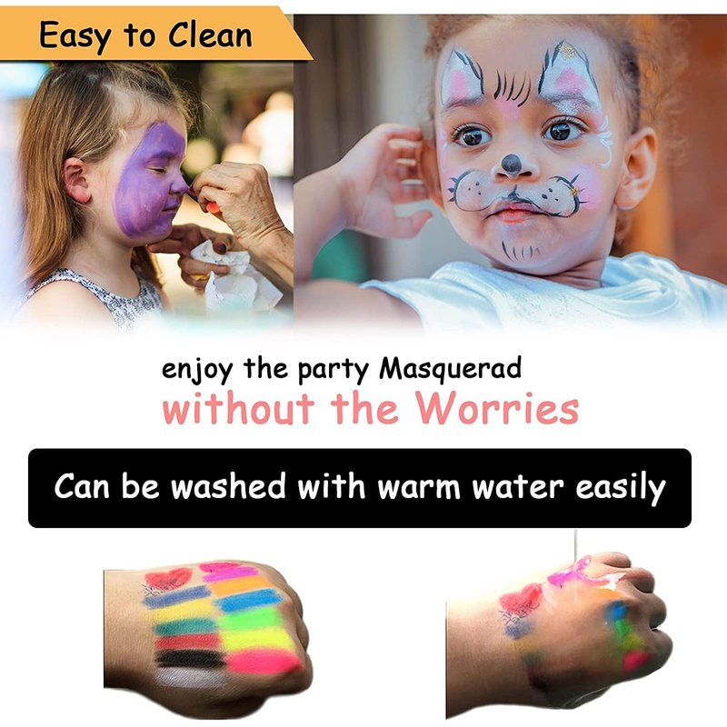 - [Safe for Skin] The face painting set includes washable crayons that are easy to remove with mild soap and warm water and will not irritate the skin of children and adults. If you are a little concerned, it is recommended to do a small skin test before use.