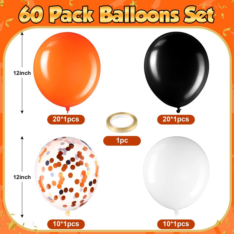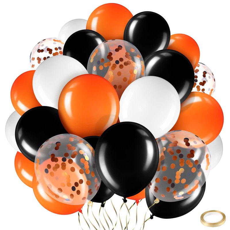 60 Pcs Balloons Kit 12 Inch Confetti Balloons with 2 Rolls Ribbon Latex Balloon Party Favor Metallic Balloons for Memorial Day, Birthdays, Fourth of July, Halloween Decorations(Black, Orange, White)