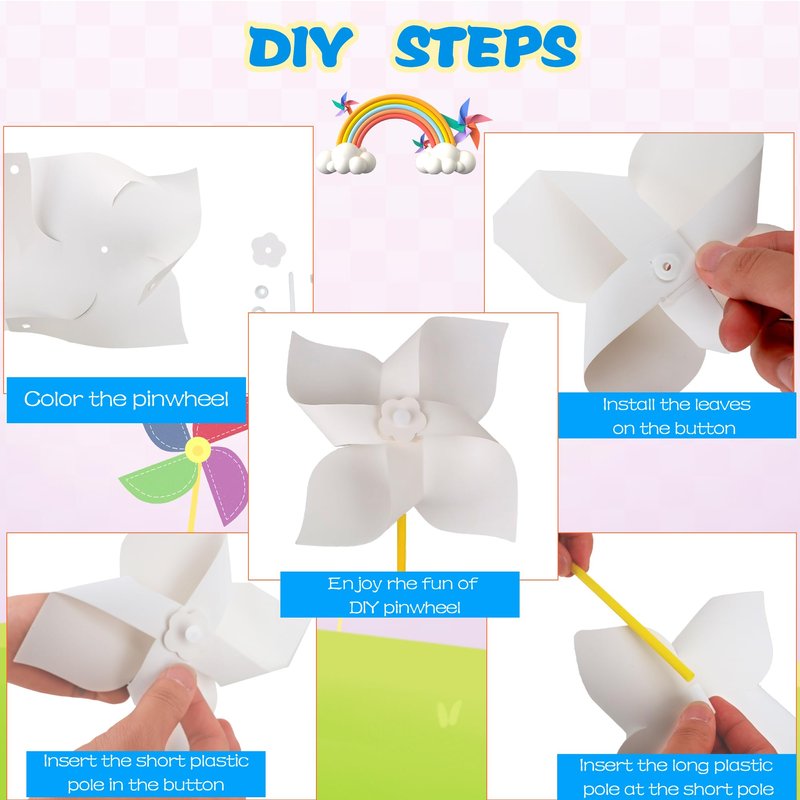 - 【Quality Material】: the pinwheel leaves are made of thick white cardboard, which are very easy to paint colors, not easy to deform and tear, the colored rods are made of plastic, strong, durable and safe to use