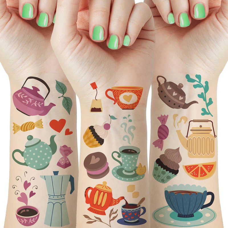 - Tea Party Temporary Tattoos: You will receive 12 sheets 60 pieces Tea Party fake tattoos, Tea tattoos cover a variety of cute stuff regarding tea pot, tea cup, cupcake and other accessories.