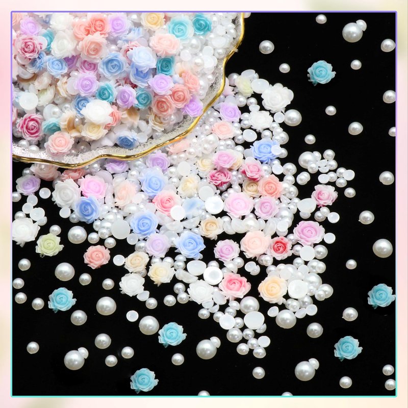 600Pcs Flower Nail Charms and Flatback Pearls,Mixed Size 3D Rose Flowers Nail Charms for Acrylic Nail Supplies Design,White Half Pearls for Nail Jewelry DIY Crafts Nail Art Decoration Accessories