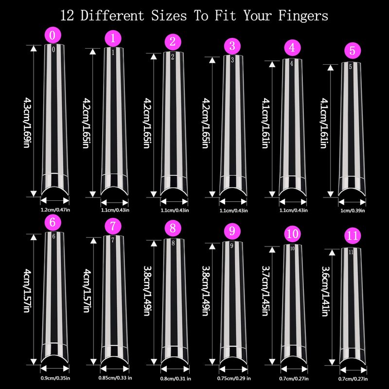 - 【12 SIZES XXL Extra Long Coffin Nail Tips】: Our 600 pcs clear nail tips for acrylic nails has 12 different sizes to suit for most finger. XXL nail tips no c curve has the pre-numbered, numbered 0-11 individually for you to distinguish easily and find your desired nails quickly. And 2 extra size can fit bigger or smaller nails, in case 10size can not suit few of your nails.