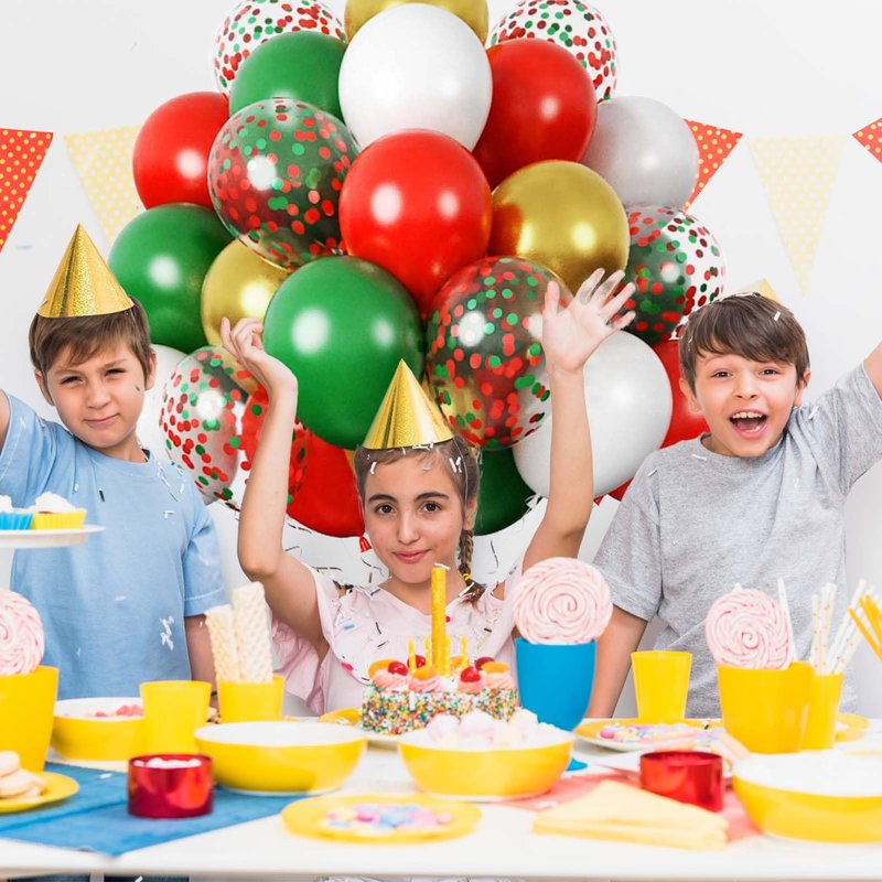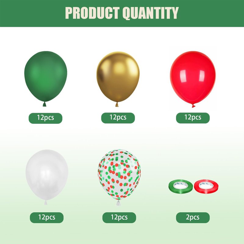 - 【Party Balloons Decorations Set】Our balloon decorations set includes 12PCS 10IN Green Balloons,12PCS 10IN Red Balloons,12PCS 10IN Gold Balloons,12PCS 10IN White Balloons,12PCS 12IN Green Red Confetti Balloons,2 rolls of ribbon. The sufficient number of baloon is enough for you to decorate a unique party and make any dull space full of vitality and joy.