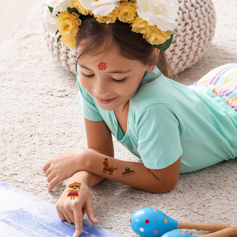 - Fiesta Party Decorations: These fiesta fake tattoos are the perfect accessories for Mexican fiesta party decorations, cinco de mayo party supplies, taco birthday party, bachelorette party, party games, body art, DIY decorations and so on.