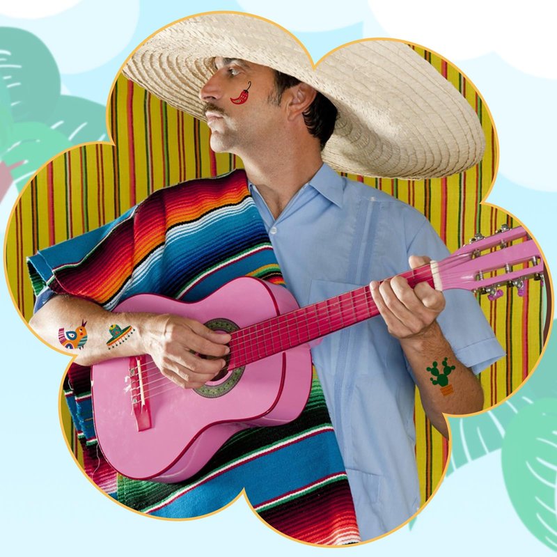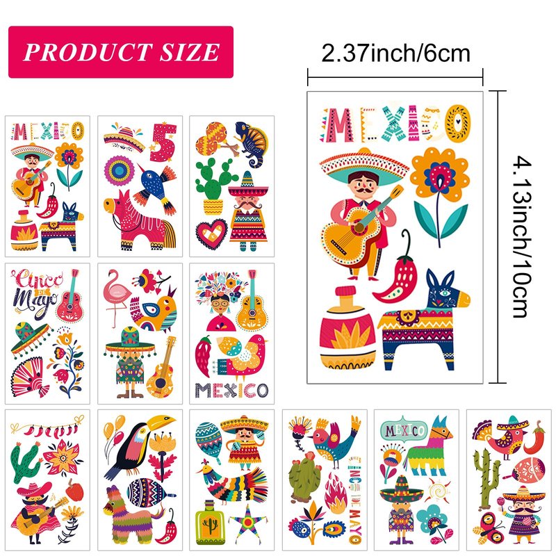 - Cinco de Mayo Decorations: 65 pieces 12 sheets Cinco de Mayo tattoos feature various Fiesta theme patterns, such as cactus, guitar, sombrero, llama, Chili and some meaningful words.