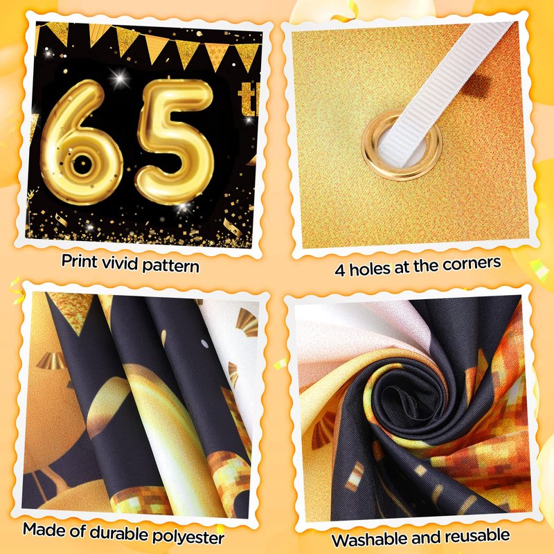 - ✨【BANNER MATERIAL】: The black and gold happy 65th birthday yard banner for men and women is made of durable polyester, lightweight, foldable, and washable. it can be reused for a long time.Printed with "HAPPY 65th BIRTHDAY", combined with 18pcs balloons as party decorations, it adds a great party atmosphere to a birthday party.