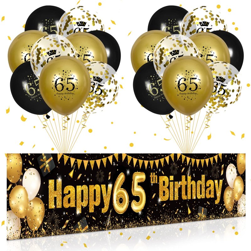 - ✨【65TH BIRTHDAY DECORATIONS】: You will get a black and gold 65th birthday banner, 18 pieces of latex happy birthday balloons with a ''65th Happy Birthday'' pattern (6pcs gold balloons + 6pcs white balloon +6pcs transparent Inflatable Clear Confetti balloons). It would be an impressive decoration for 65th Years Old birthday party 65th anniversary birthday party.