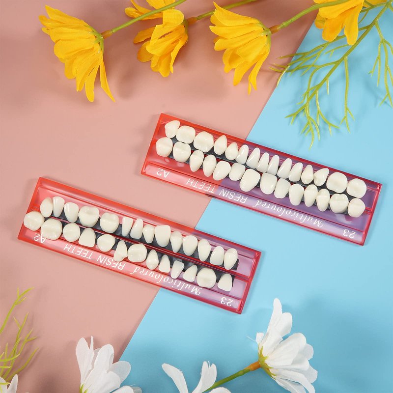 - Product information: denture replacement teeth are made of acrylic resin, secure and reliable; The color is A2, very realistic; With the fitted acrylic background board, the fake dentures set can be stored better