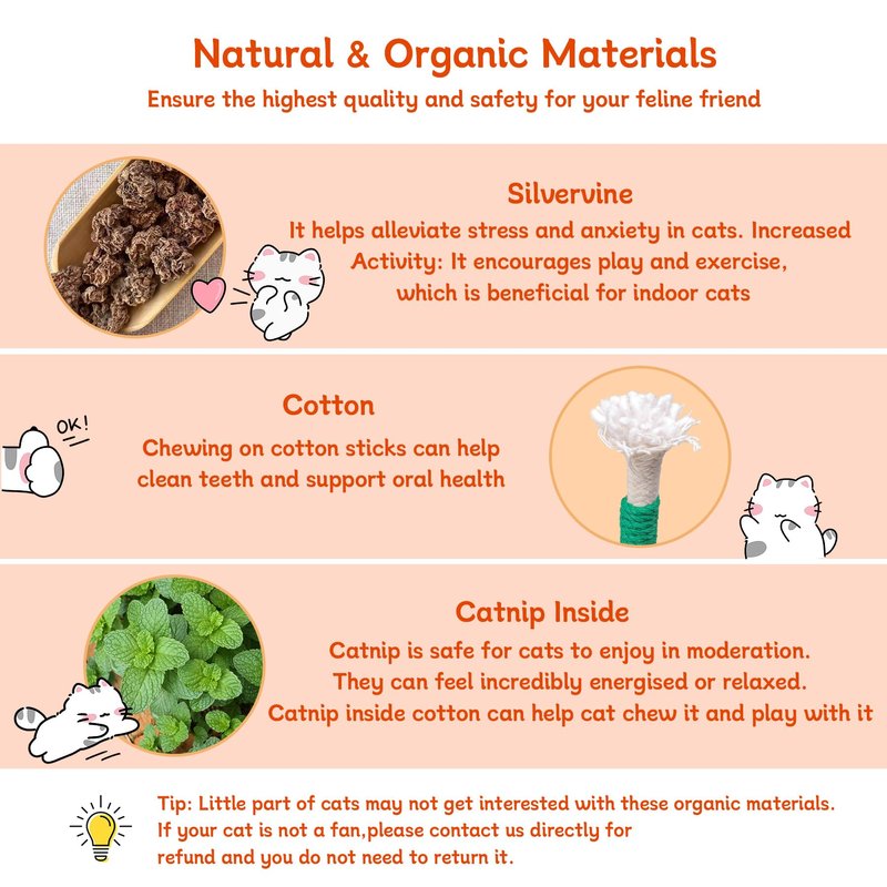 - Chew Toys for Kitten Teeth Cleaning: No artificial flavor here! Freshly organic catnip is used to fill these cute chew rope toy to freshen your cat's breath with every bite. Your kitty will enjoy batting and swatting this minty chew toy during interactive or solo play