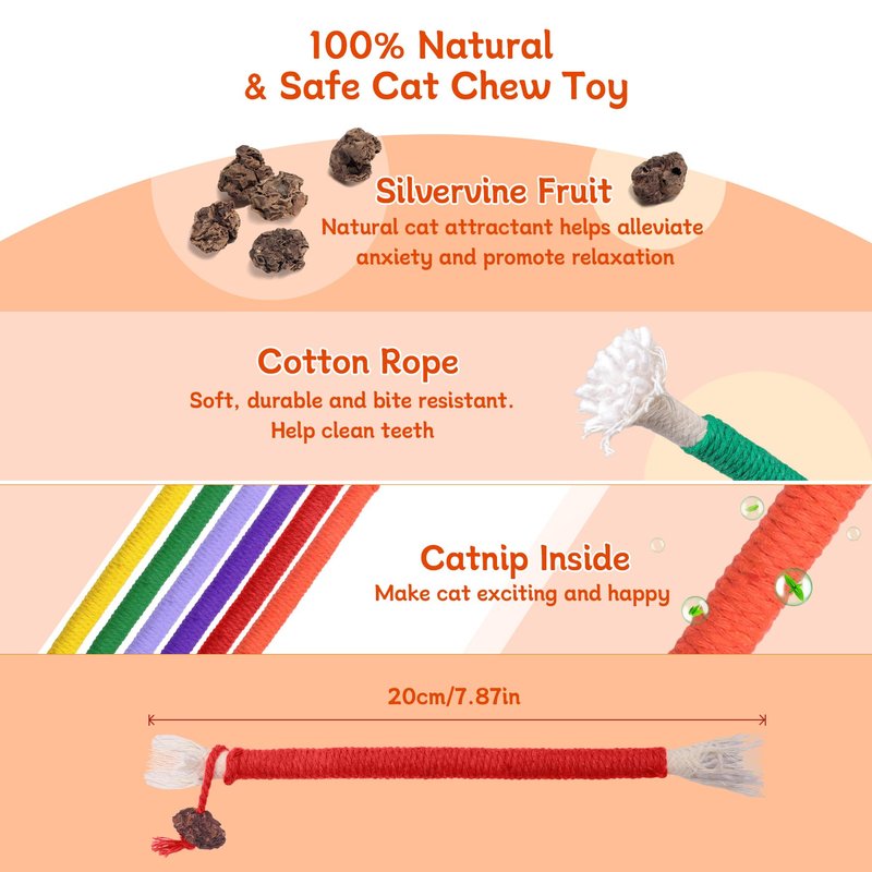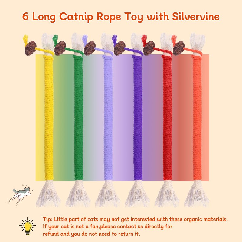 - Cat Birthday Gifts: Perfect gift for kitten teething toys, includes 6 cotton rope silvervine chew toys, Multi-color choice, catnip rope toys are great gift choice for cat birthday holiday present etc.