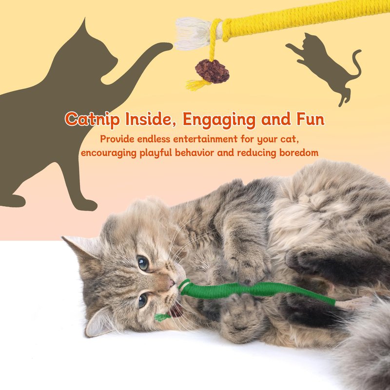 6-Piece Catnip Toy Set for Indoor Kittens and Cats Chew Toys for Teeth Cleaning: Filled with freshly organic catnip, these chew rope toys freshen your cat's breath with every bite. Ideal for both interactive and solo play, your kitty will love batting and swatting these minty toys. Dental Care Rope Toys: Made from natural sisal rope mixed with cotton, these toys help remove soft plaque and tartar. The soft rope is gentle on gums, ensuring no irritation even with excessive biting. Self-Play and Quiet: Unlike noisy squeaky toys, these catnip toys operate silently, making them perfect for night-time play. They won't damage your furniture or require constant supervision. Durable and Soft: The braided design ensures safety and durability, even for the most vigorous chewers. These toys are built to withstand aggressive chewing, making them a long-lasting option. Perfect Cat Birthday Gifts: This set includes six cotton rope silvervine chew toys in multiple colors, making them an excellent choice for birthday or holiday presents.