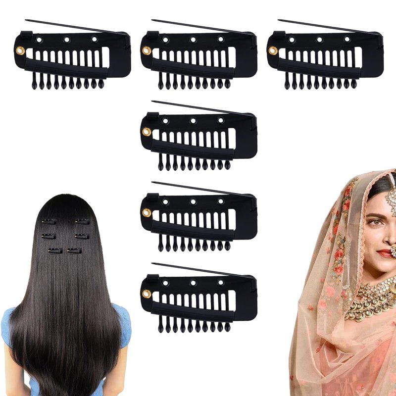 6pcs Chunni Clip with Safety Pins Wig Clips to Secure Hair Accessories Hair Extension Clips for Dupatta, Hijab Indian Costume, with Rubber Snap to Easy Operate (Black)