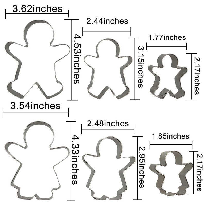 - PACKAGE: 6PCS Gingerbread cookie cutter sets with different size, including 3pcs gingerbread boy cookie cutter and 3pcs gingerbread girl cookie cutter