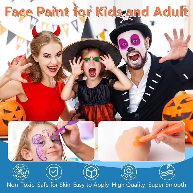 - 【Wide Application】This kids & adults glow face paint stick set is the perfect choice for Halloween,Carnival,Blacklight birthday party,cosplay,masquerade,concert and other neon party occasions.Let your makeup shine under black light,and you can use it to accessorize your everyday makeup.