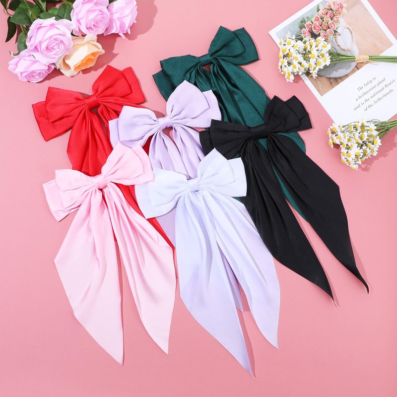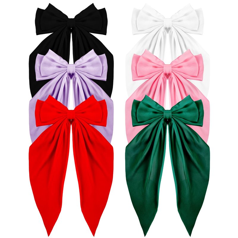 6PCS Silky Satin Hair Bows Big Bow Barrettes Long Tail Oversized Hair Ribbons Metal Bowknot Clips Ponytail Holder Aesthetic Accessories for Women Girls Toddlers Teens Kids