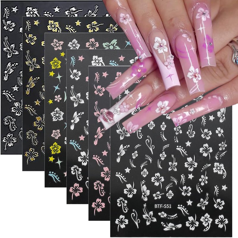 6Sheets Colorful Hibiscus Flower Nail Stickers Self Adhesive Pink White Floral Nail Decals Gold Silver Star Cherry Blossom Petal Nail Design Nail Art Stickers 3D Nail Supplies Pegatinas Uñas for Women
