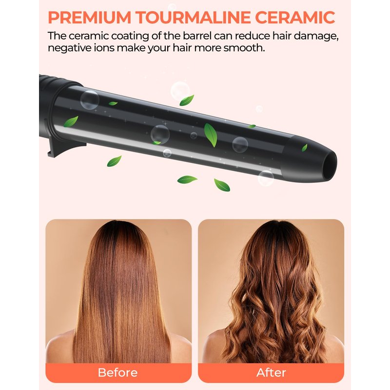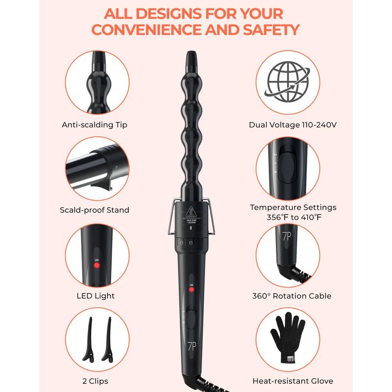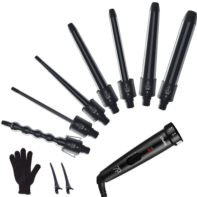 - 7-in-1 Curling Wand Set: Get the gorgeous hair you've always wanted without running to the salon every week! You can do almost anything with the 7 different sized barrels (0.35-0.7inch, 0.37 inch, 0.75inch, 0.75-1inch, 1inch, 1-1.25inch and 1.25inch). Plus, universal 110v-240v dual voltage, 2 clips, heat-resistant glove and the 360° swivel cord make it travel-friendly, safe and convenient to use.