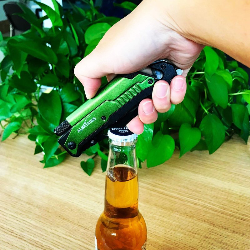 - 7 tools in one! Includes all of the following: Flat Blade Knife, Serrated Blade Knife, Fire Starter, Bottle Opener, Glass Breaker, Belt Cutter, and LED Light.