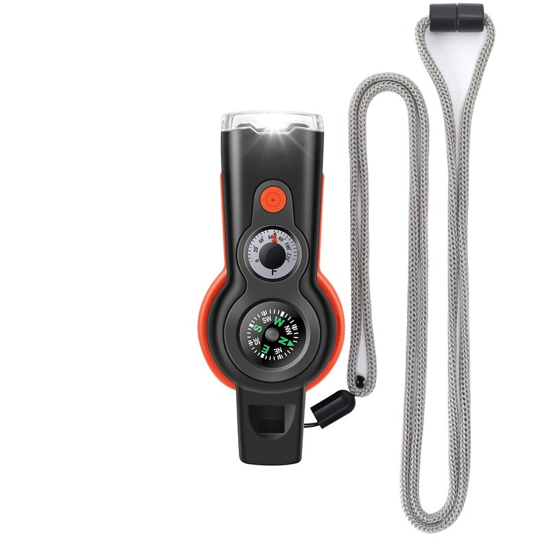 - 【Unmatched Versatility】The 7-in-1 Safety Whistle sets 7 functions including Emergency Whistle, Compass, Thermometer, LED Signal Light, Magnifying Glass, Reflector and Sealed Warehouse with good playability (The uniquely designed miniature built-in storage bin can be used to store important personal information, allowing rescuers to grasp your situation at the first time) (NOTE: If you need help in an emergency, you can try whistling softly, which is louder than whistling at full force)