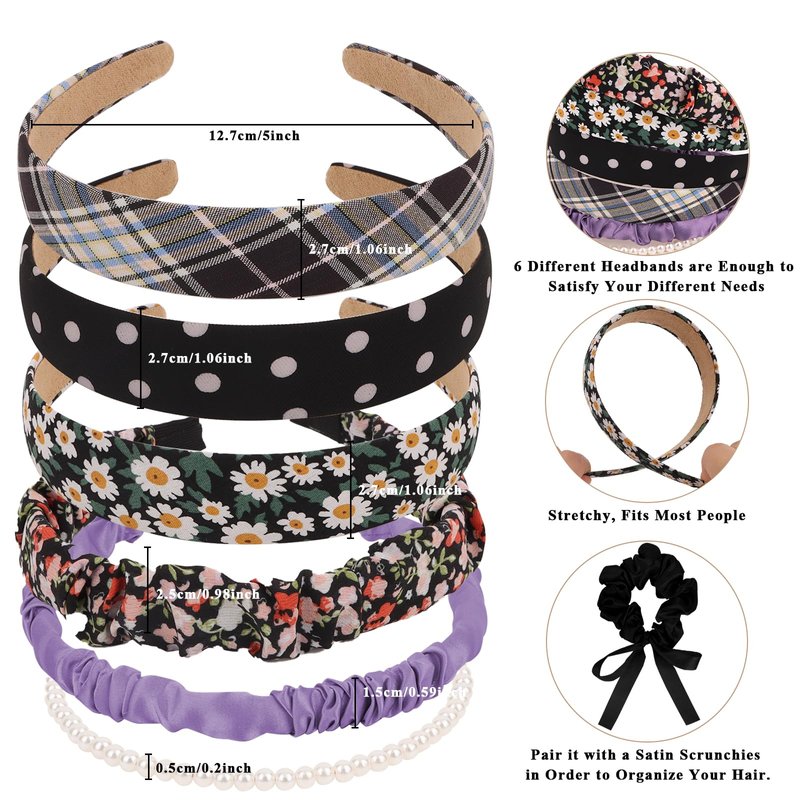7 Pcs Fashion Headbands for Women with Satin Scrunchies Black Headbands for Girls Pearl Headbands for Women Trendy Padded Headband Thin Headbands for Women Croquette Aesthetic Cute Accessories