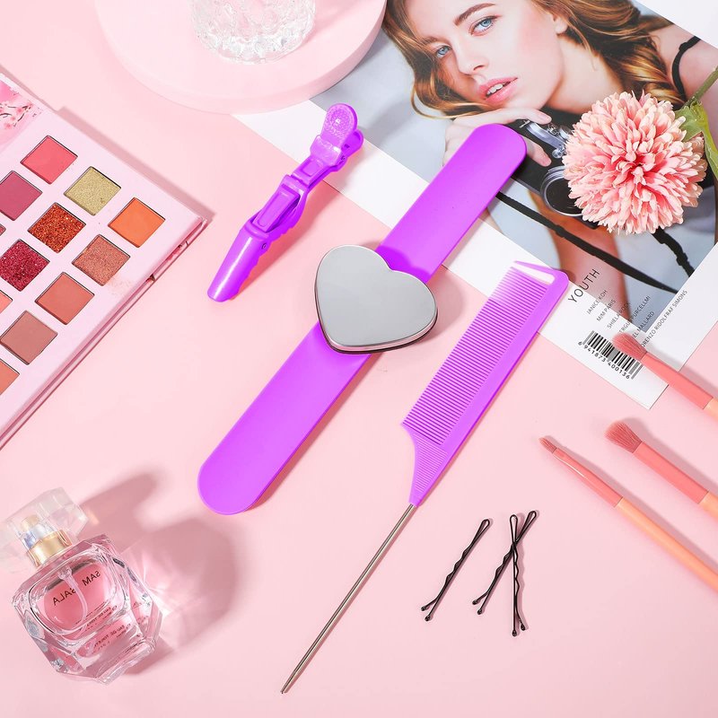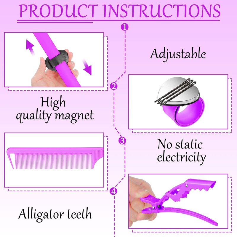 7 Pieces Hair Braiding Tools 1 Piece Magnetic Pin Wristband and 2 Pieces Stainless Steel Pintail Rat Tail Comb with 4 Pieces Wide Teeth Alligator Sectioning Hair Clip for Hair Braid Maker (Purple)