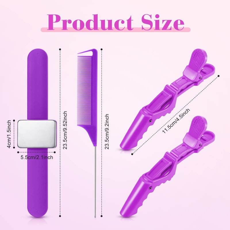 Features: Wide application: You can use these purple rat tail combs and sectioning alligator hair clips to design different hairstyles for yourself, children and family members in your daily life, and these items are also ideal for hair salons. Easy to use: Our purple pin tail combs and sectioning hair clips are light in weight and small in size, which are easy to carry and store, and do not occupy too much space. The magnetic pin bracelet will be easy for you to use when sewing and making jewelry. Specifications: Main material of pincushion: silicone Material of combs and hair clips: plastic, stainless steel Main color: purple Size of wristband: approx. 9.44 x 2.36 inch Quality: 7 pieces Package includes: 1 x Magnetic pincushion wristband 2 x Rat tail combs 4 x Sectioning alligator hair clips Note: Manual measurement, please allow slight errors on size. The color may exist slight difference due to different screen displays. Pointed parts included, please keep away from kids.